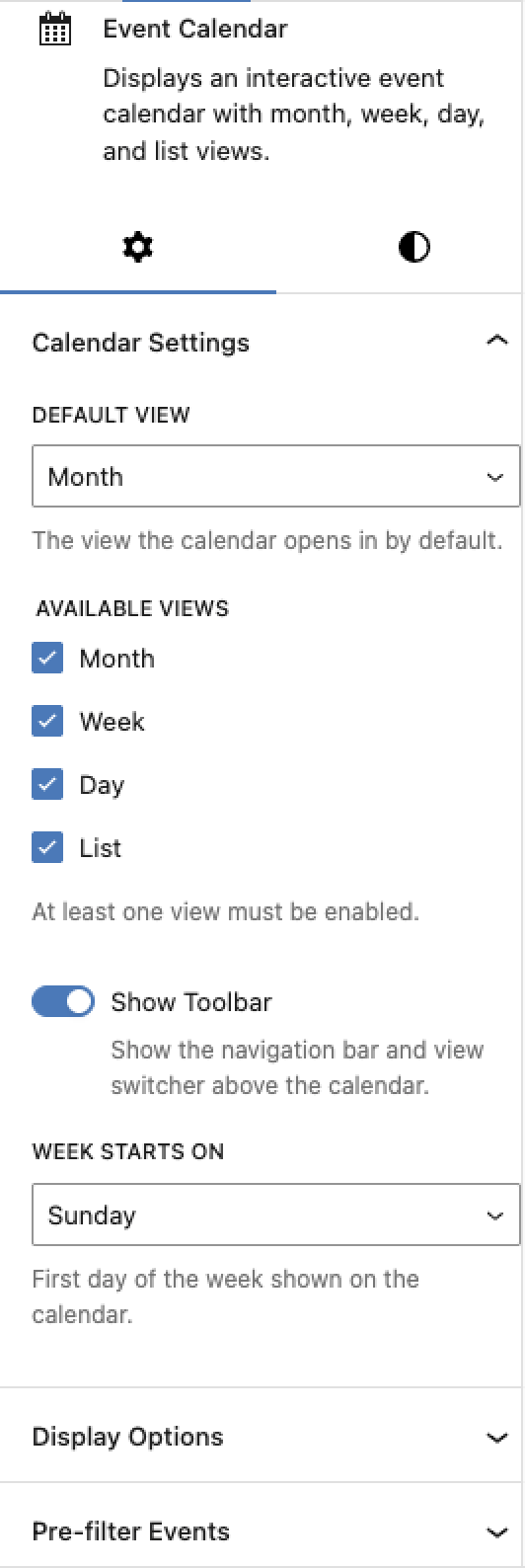 - Default view — Which view loads first: month, week, day, or list